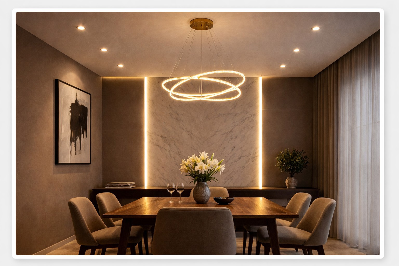 تصميم إضاءة غرفة الطعام بشكل صحيح لا يعتمد فقط على اختيار ثريا جميلة، بل على تحقيق توازن بين الإضاءة المباشرة فوق الطاولة، والإضاءة العامة، والإضاءة الديكورية التي تضيف عمق وجمال للمكان.